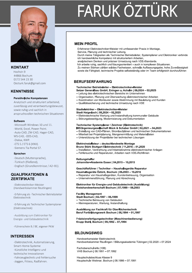 Erfahrener Elektrotechniker-Meister mit umfassender Praxis in Montage, Service, Planung und technischer Leitung. Durch meine Tätigkeiten als Technischer Betriebsleiter, Systemplaner und Elektroniker verbinde ich handwerkliche Kompetenz mit strukturiertem Arbeiten, analytischem Denken und präziser Umsetzung nach VDE-Standards.